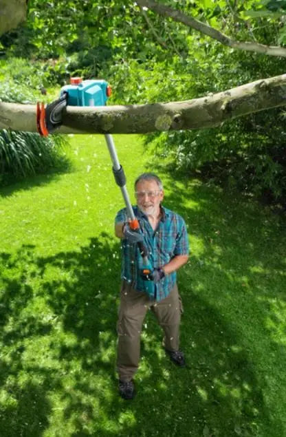 - Ora non dovrete più arrampicarvi sugli alberi: con il seghetto da potatura a batteria GARDENA TCS 20/18V P4A potrete lavorare in tutta sicurezza da terra.
